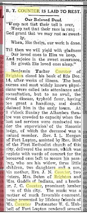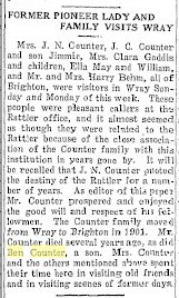 1899 "F.T. Counter of Twin Bridge, Mont, brother of J.N. Counter and Mrs. A.W. Lawrence, spent a few days in Wray this week. He has been a resident of Montana for the past eighteen years, not having met any of his family for that length of time."