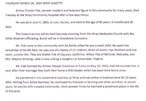 Arthur Chester Fisk 1883-1964 is buried in Wray # 17936390