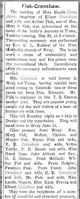 wedding of A. C. Fisk and Miss Maud Crenshaw in Wray, Colorado May 24."