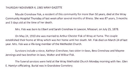 In 1920 Art and Maude are alone in Wray, and in 1930 they have Sarah C. Crenshaw, 74 born in Pennsylvania, with them.