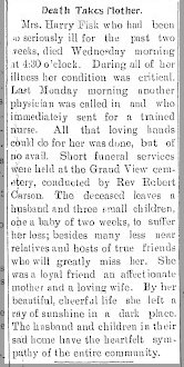 Nov 6, 1913 "Mr. and Mrs. Harry Fisk and little daughter, Miss Gladys, returned to their home in Arvada, near Denver, Friday afternoon after a visit with the A. C. and M. M. Fisk families and Mr. and Mrs. Bernard Jennings. Mr. and Mrs. Fisk and Miss Gladys spent about three weeks in this vicinity."