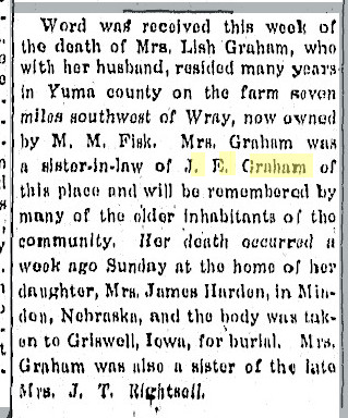 In 1900 Wray, Joseph E. Graham, born January 1852 in Illinois, is farming, married 28 years to