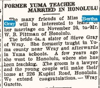 June 1916 "This office is informed that Miss Bertha Gray has accepted a position in the Yuma schools for the coming year."