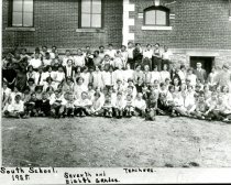 Black and white photograph of students in the seventh and eighth grades posed outside of South School in 1928. The teachers are identified as: R.T. Brown, Reva Teale, Edna Gray, and Mrs. Carroll.