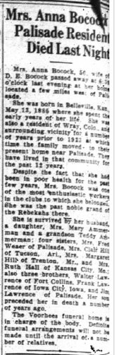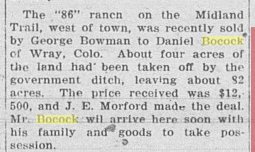 1917 "A. Bocock and son, Dan, and Mrs. and Mrs. Fred Weaver left last Monday for Antioch Nebraska, where they went to attend a sale of land which was held at that place. They are thinking of locating there."