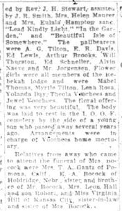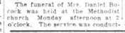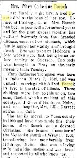 The 1913 funeral of Mary Bocock, mother of "Daniel Bocock of Wray" was held at the A.W. Lawrence house in West Wray.