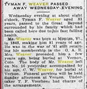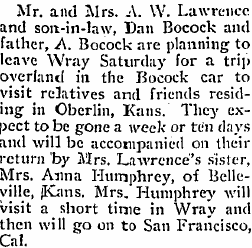 1916 "the Dan Bocock family of north of Wray, and Mrs. and Mrs. Fred Weaver and little son of near Vernon, together with Miss Lorena Stewart, who is teaching the Wells school this year, are being entertained at the home of Mr. and Mrs. A.W. Lawrence today."