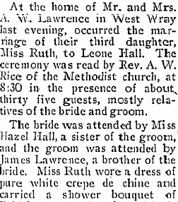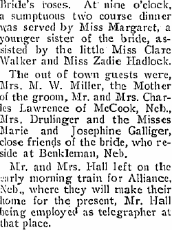 1916 "Mr. and Mrs. Leon Hall of near Alliance, Nebraska, are visiting relatives and friends in Wray this week. Mrs. Hall's parents, Mr. and Mrs. A.W. Lawrence and Mrs. Hall having two sisters, Mrs. Hopkins and Mrs. Blaine Churchill, residing here."