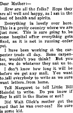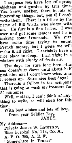 James married Louise Laurence. 1919 "It is reported that Walter Click, Clyde Cumley and James Lawrence have sailed from France for home.