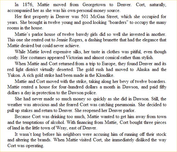 "The Rocky Mountain News in 1928 interviewed the notorious Denver Madam Mattie Silks, one last time at the age of eighty-two. Historian Secrest writes that the reporter remembered her talk with Mattie, which was left unpublished by a paper become too prudish for honesty: “She smiled kindly at us (the reporter and photographer) as we left. There may have been a little contempt in her smile and I felt there was - but it was good humored contempt mixed with a little pity - the look of a woman who believed she knew a great deal more about this world than we did. It was with a definite feeling of disappointment I left the premises and not without a certain amount of scorn.