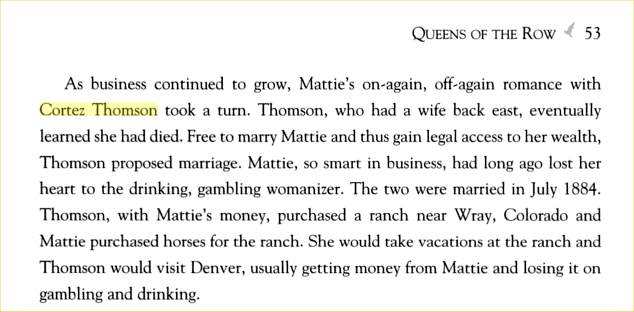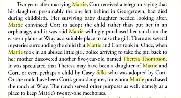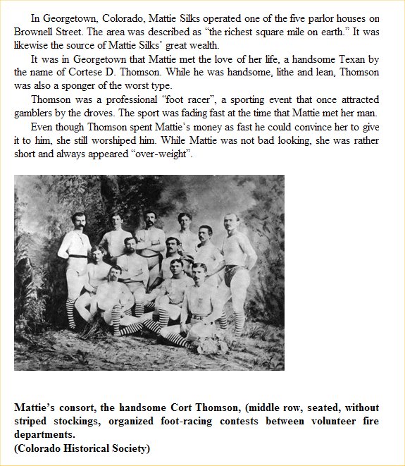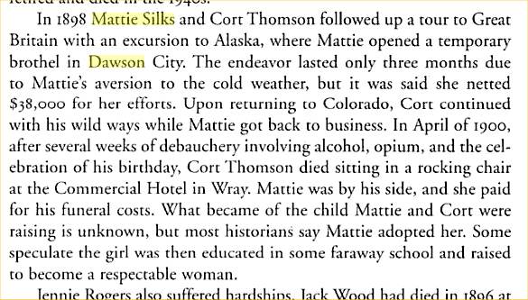 AND Mattie Silks - under that name, is in the 1900 census for Denver - head of a household on Market Street, born in New York, with eight young single female boarders with no occupation. The names and places of birth given the census-taker sure look contrived.