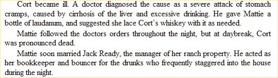 Another version says that Mattie suspected Cort was going to sell her horses (he was in financial difficulty) and had come to prevent that. This version said Cort developed ptomaine from eating spoiled oysters, and died at sunup April 12 at "Grandma Simpson's" hotel