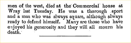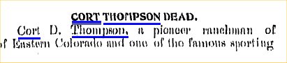 Cort D. Thomson is dead. He came up from his ranch Friday night, suffering with acute pain which developed into pneumonia and 10:50 Wednesday morning (that would be April 11) he passed away. He was attended by his wife during his illness, and she accompanied the remains to Denver on the1:50 train the same day. A nephew of the deceased has taken charge of the ranch. Cort was a heavy drinker and it is said that on account of the ravages made by the whiskey that he was unable to successfully cope with the disease.