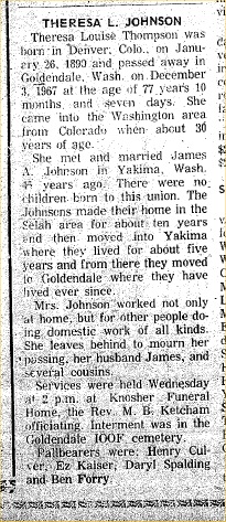 FindAGrave has a Theresa L. Johnson in the IOOF cemetery at Goldendate, Klickitat County, Washington, born in 1890, dying in 1967. Block H, Lot 8.00, Space 2