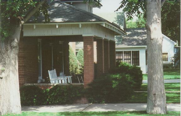 Summer 1975 - "Powells' porch - (Sullivan house hidden) and Kitzmiller's " Patrick Sullivan writes of his memories of the Powells "Their one story brick bungalow was next door to ours.... I would amble across our front yard, jump down the little cement embankment dividing the properties, and go for visits with Ethel and Ken. I would assume at age five then in 1943 - a mature manner as best I could. I felt older in the company of Ken and Ethel. They had no children. I did not know any other couple in Wray in 1943 who did not have children. Ken and Ethel Powell were my 'second parents' and years later I would be able to see their importance in my life. The Powell's house had a big front porch. As the years went by, my brothers and sister and I would pose there for Ken's camera, would enjoy the seat swing suspended on one side, would spend time listening to their many friends. Ken was one of the town fathers. He was a sportsman. He was from western Nebraska not far from Wray, which was almost in Nebraska itself. I could tell that Ken kept friends. It was wartime, but his generation was too old to be soldiers. Ken owned the town movie theatre. My brother Dan and I saw our first film there: SNOW WHITE AND THE SEVEN DWARFS. That was on a cold winter afternoon. The popcorn vendor's brightly-lit little wagon stood in the street outside the theatre. The gaiety of the colors, the thick smell of the popcorn, the steam rising above the music of the popping - a small spectacle of carnival pleasure. Inside the theatre a giant man stood immobile on the screen. He held a sign which read 'WELCOME.' I could not understand how the man got to be so gigantic. I wanted to understand the mechanics of film that first time. From the Powells' porch we Sullivan kids could see the procession of combines, cattle trucks, cars and trucks and tractors and other farm machinery through town on our Third Street, the main east-west road. We kids saw as well across the street 'the Sullivan place,' a big Victorian type house where our father lived when he was a young child. I could never picture my father in that house, Dad never spoke of it, never spoke of the Wray of his childhood. I remember a succession of families renting the house, and becoming friends with a kid who lived there.. But the inside was unknown, and dark. The Powells house was modest and cozy and inviting. It smelled good and with the absence of children the house had a quietness I found remarkable At the desk in the living room I could fiddle with the pens and pencils kept in a round receptacle. I would often be reminded to tidy up after spreading them out or reading the names of the companies on those pens and pencils. I could picture a world of commerce and correspondence coming from that supply. I liked being alone there. I could play at that desk for hours. My time there held such enjoyment and power. I did not know why. I was never really alone there. Ken would be fixing a fishing rod or puttering around with some chore in the basement. Ethel would be cooking or sewing or 'doing the books.' Their talk was easy, she the more subdued. Ethel often laughed loudly at something Ken would say. They spent a lot of time together. My parents seemed in separate worlds, and their talk reserved, in comparison to the Powells. I liked being the kid - the only kid - in the Powell house. Ken and Ethel were friendly with our mother and father, but they were especially friendly with us kids- Patrick and Dan and Terry and then near the end of our years in Wray, the first girl, Cathy. The Powells went to church occasionally, but for the most part appeared indifferent to things religious. They were avid card players, loved to drive here and there for meals and visits with friends. They seemed to me to have a special gift for making life feel good and companionable and to be contented and relaxed in ways that my mother and father were not. Ken always had a fine new car, after 1945, that is, and Ken also had, after 1945, an airplane! When the war ended in 1945 the farmers and ranchers in the Wray area found they had made lots of money and many bought themselves a small one-engine plane. There must have been twenty-five of them at the little airport out north of town with its dirt runway and ragged wind-sock. Kenneth owned an Aircoups, a sleek aluminum two-seater with the wings below the cockpit. Ken did not give Dan and me our first plane ride, though. Gale Rodgers did The door on the passenger side would not stay shut, and I faulted Gale for not caring about that. I could sense that Gale was wild. In 1946 he and a German farmer from Idalia, Fritz Brenner, were killed when Gale nosedived his T6 Army trainer into the ground. I learned that their bodies had been 'pulverized.' That word stuck in my throat when at night, I dutifully remembered the two men in my prayers, Gale was giving Fritz his first plane ride. Gale Rodgers had the fitful gaiety and charmof a dissolute uncle, with Kenny Powell I would never tire of his calm, self-assurance, guiding maturity, composure, humor, and endless array of interests and activities. Just after I turned nine we Sullivans moved to California. I sat in the Powells' kitchen and said goodbye. I knew I would see them again. Ethel was tearful but smiling, Kenneth gentle and kidding. I would indeed be back, but under what circumstances I could not have imagined. Summer of 1954 -The night train rocks back and forth as it heads east from Denver towards Wray. I'm sixteen and on my way to visit Ethel and Ken for several weeks. I try to read FATHERS AND SONS, don't understand it, and by the time the train reaches Fort Morgan I was too drowsy to continue. The air in the train has grown musty, and I sweat in the dry heat. Anxious not to fall asleep and miss my stop, I study the towns as they roll by: Brush Akron, Otis, and Yuma. At Yuma my heart beats faster. The train slips throught Eckley and soon we are slowing down for Wray. The night is moonless,