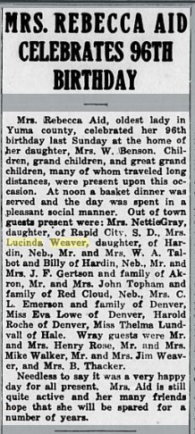 July 1932 Wray " Mrs. Wm. Benson entertained at a birthday dinner in honor of Mr. Wm. Benson, Mrs. John I-Aham, Mrs. Geo. Murphy, and Bus Benson last Sunday. All of the four had birthdays in the first two weeks of July. The dinner was a great success and in the afternoon Mr. and Mrs. Murphy entertained with music. Those present were Mr. and Mrs. Wm. Benson, Bus and Bernard Benson, and Grandma Aid of Wray, Colorado; Mrs. C. L. Emerson and children and Glen Lowe of Denver; Mr. and Mrs. James Gertsen and family of Akron; Mr. and Mrs. John Topham and family of Red Cloud, Nebraska; Mrs. Lucinda Weaver of Kansas City; Mr. and Mrs. George Murphy and daughter, Mildred Evelyn of Flora, Illinois and Miss Esther Haug of Pasadena, California."