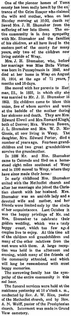 1919 "Mrs. Howard Klugh and Mrs. Elwell of Denver are in Wray to visit their father, John Shumaker, brother, J. L. Shumaker and sisters, Mrs. Warren Bowen and Mrs. W. D. McGinnis."