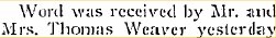 September 1915 "Word was received by Mr. and Mrs. Thomas Weaver yesterday of the