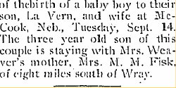 The three year old son of this couple is staying with Mrs. Weaver's mother, Mrs. M. M. Fisk,