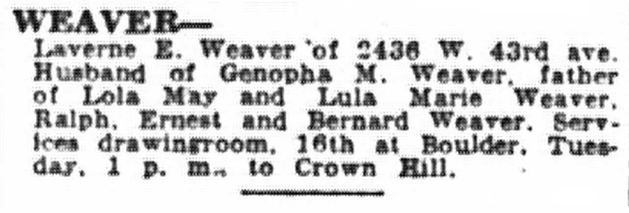 In 1940 Denver, Genopha is widowed, 49, with Ernest L. 25, Bernard 23, and Lola May 20.