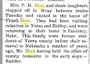 Mrs. Mary L. Pesch, mother of Mrs. L. A. Mustain [Alice] and Mrs. J. R. Deering [Mary Teresa "Molly"], died at the home of a daughter, Mrs. W. L. Stevenson, at Fort Morgan last Thursday at the age of 85 years. the remains were brought to Yuma and funeral services were held at the Presbyterian church, Rev. S. D. Goodale officiating, and interment was at the Yuma cemetery. Mary Luhetty Strain was born February 8, 1848 at Bethany, Illinois and died June 9, 1933 at Fort Morgan, Colorado. She was married October 17, 1872 to John P. Pesch, who preceded her in death in the winter of 1908. To this union were born seven children, namely Mrs. P. H. Shea, of Fairbury, Nebraska, C. A. Pesch and Mrs. F. G. Lett of Denver, Mrs. J. R. Deering and Mrs. L. A. Mustain of Yuma, Mrs. Walter Stevenson of Fort Morgan, and Mrs. Henry Stevenson of Wray. Mr. and Mrs. Pesch went to Nebraska as pioneers in 1881, settling near Holdredge. Eight years later they came to Eastern Colorado, where they made their permanent home. Mary Pesch was affiliated with the Methodist church of which she was a devoted member. Besides her seven children, she leaves to mourn her death a brother, William Strain of Kingman, Kansas; twenty-eight grandchildren; and two great-great grandchildren. All of her children and most of her grandchildren were were present at the funeral, six grandson acting as pallbearers. Yuma Pioneer, Yuma, Colorado June 15, 1933 Transcribed by Carol Moore. |