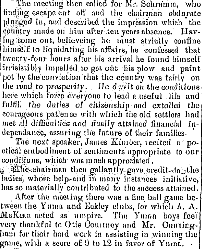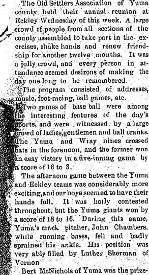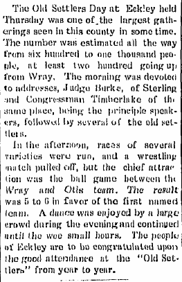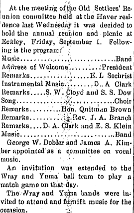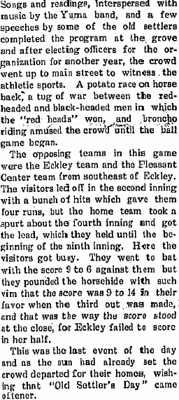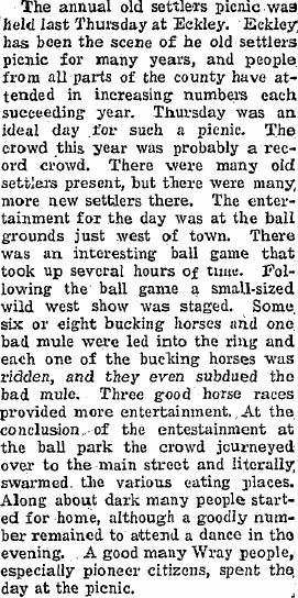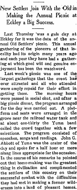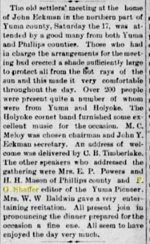 The Old Settlers' Picnic at Eckley was attended by a large crowd from Yuma,