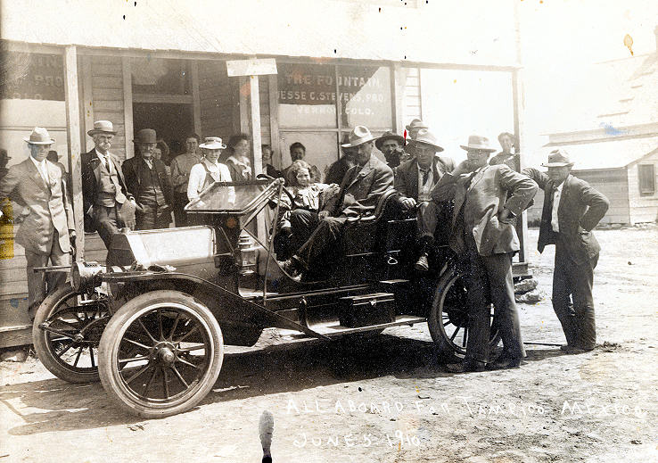 Above titled "All Aboard for Tampico Mexico, June 5, 1910." This photo shows Jack Wakefield (behind the wheel), Jim Stevens, Bab Southwell and Bill Lohman in front of Jesse Stevens post office and "Fountain". The only other individual I can identify is Lyman Weaver (white mustache, vest and bowler leaning against the post at the left).