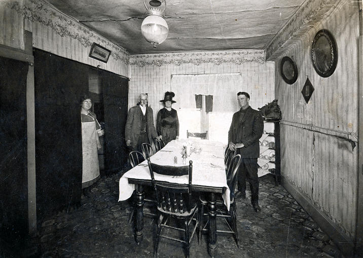Below is the Weaver Vernon Hotel Dining Room. From the right Ort Weaver, Belle Weaver and Lyman Weaver. I can't identify the cook.