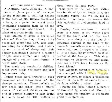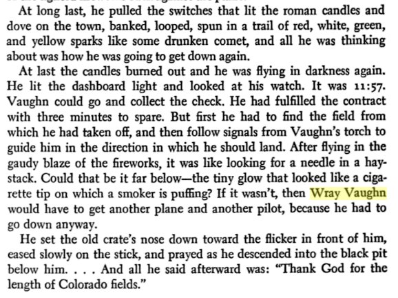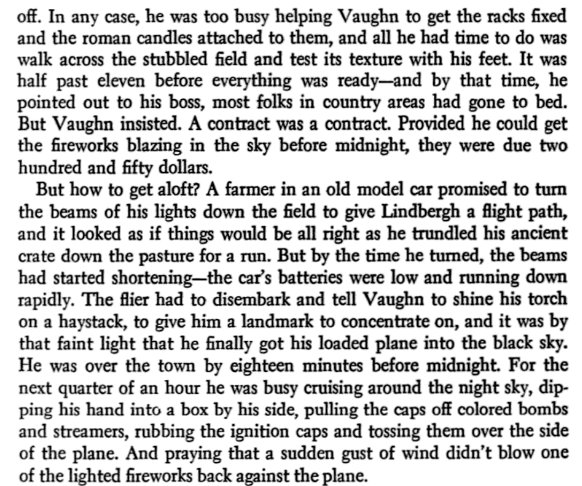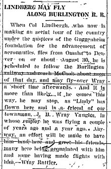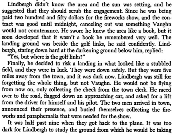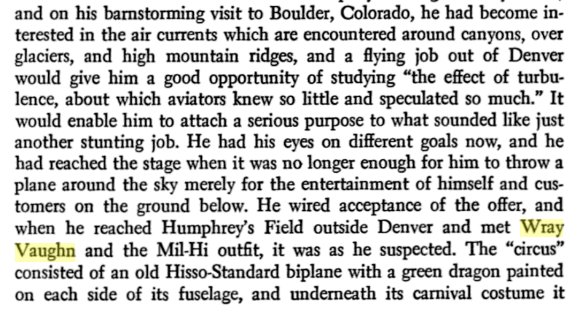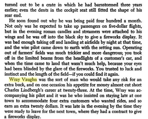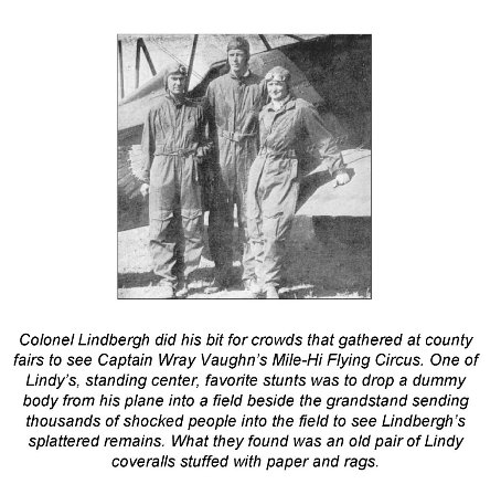 The man who had hired Lindbergh, upon the recommendations of the Robertsons, was a Captain J. Wray Vaughn who wanted, as he had said, "a pilot with plenty of nerve who knows his business." He had never heard of Lindbergh before, and when he went to the Denver railway station to meet his new employee he saw no one get off the train who seemed likely to be his man. Not until the platform crowd thinned out did he notice "a tall, gangling kid in a misfit blue suit, about three sizes too small for him," wearing a worn cloth cap and carrying a cardboard suitcase and a duffel bag. He and the "kid" were virtually alone on the platform before the latter came up to ask in a hesitating, half-apologetic tone if he were Captain Vaughn. "I am," said Vaughn, "I'm Lindbergh." Vaughn was perhaps openly dismayed. He later confessed that he said to himself, "If this kid is a pilot, I'm a horse." But "the first time I saw him in the air, I knew I was wrong," Vaughn went on. "There was never another like him." |
