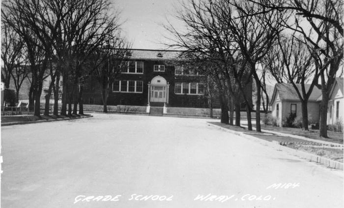 This is the front of the Wray Grade School, built in 1916, looking south along Adams to Sixth Street. This building and the 1922 brick High School four blocks west were replaced in the 1980s after 60 years of service. The WRAC building stands here today.