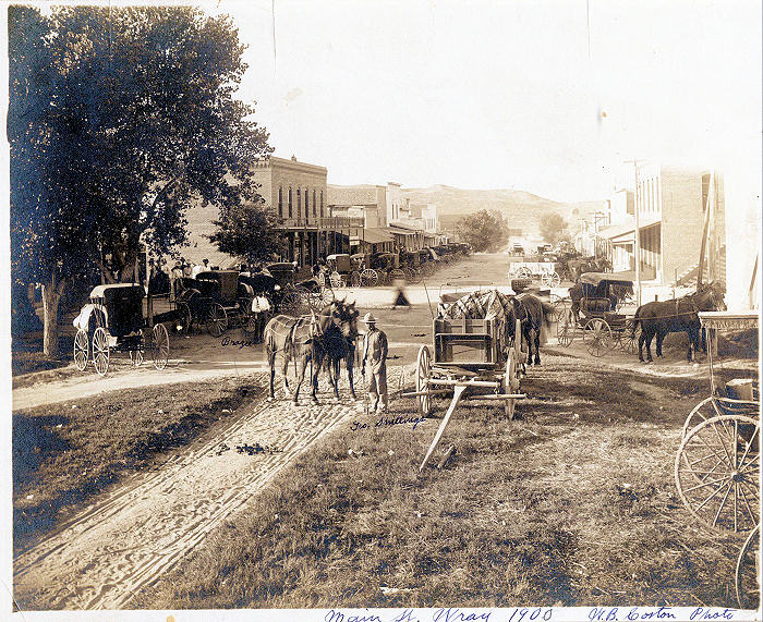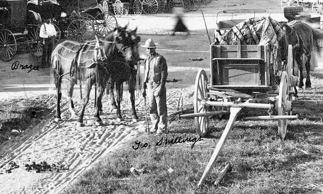 The man standing in the middle of the street is George Shillings and the one standing on the left side of the street behind the team is W.H. Brazee according to what Will wrote on the photograph. Looks like a busy day. Note that the bandstand wasn't built until later. A detail of the west side of the block is below. A second detail of George Shillings with his team follows that.