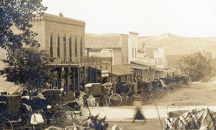 Note the second story balcony and outside stairs to reach some hotel rooms in the brick store on the left. All those wooden structures north of this brick building burned to the ground in the 1908 Chief Street fire. The brick building still stands on the corner of 4th and Main today.