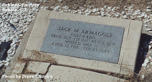 Jack M. Armagost was born at Haxtun, Colorado April 12, 1918 and was killed in action near Rome, Italy February 23, 1944 thus being 25 years, 9 months and 11 days of age.