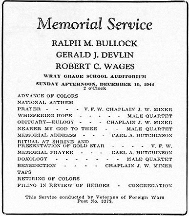 Ralph Maynard Bullock of Wray was killed in fighting in France in 1944. A son of Ralph and Cora Bullock, Maynard joined the Army in Denver on July 15, 1941, and received basic training at Camp Walters, Texas. He also trained at Ft. Bliss, Texas; Ft. Leonard Wood, Mo,: Camp Forest, Tenn.; Desert Center in California, and Ft. Jackson S.C. before shipping out on the USS Enterprise and landing in North Ireland shortly before Christmas 1943, then moving into France. He was serving with the 28th Infantry, 8th Division, and became a Staff Sergeant. He was killed by a sniper's bullet in the hedgerows of France on Aug. 12, 1944, and was buried at the U.S. Military Cemetery at St. James, France. His parents at first knew only that he was missing in action, and were notified of his death on September 30, 1944. Tribute was paid at a memorial service December 10, 1944, at the Wray Grade School.