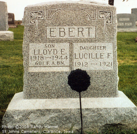 The remains of Pfc. Lloyd Ebert arrived here Tuesday morning, Nov. 30, and last rites were performed that afternoon from the Chapman funeral home. Pfc. Ebert was born in Clarence, Dec. 7, 1918, the son of Emil and Wilhelmina Muesing Ebert. He died in Italy, Sept. 9, 1944, in the service of his country, which he entered on Oct. 5, 1942. One sister, Lucille, preceded him in death, and he is survived by his parents, Mr. and Mrs. Emil Ebert of Loveland, Colo., and one sister, Mrs. Irwin Niermeyer, of Clarence. Military rites were conducted at the graveside by Victory Post No. 296 of the American Legion with R.E. Rowser as chaplain and Clarence Thien, Marvin and Harold Muesing, Arnold Conrad, Norbert Ebert and Henry Niermeyer as pallbearers.
